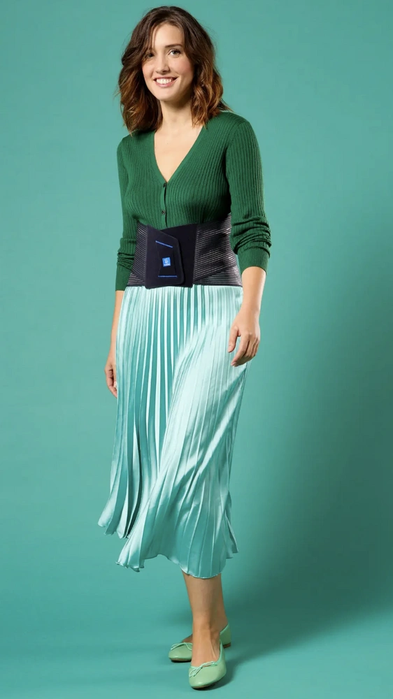 Standard lumbar belt with finger-loops to help easily tighten the belt.To indicate the sense of wear and facilitate the fitting, the product have a logo on the abdominal panel.The beaded selvedge of the fabric ensure a good comfort and a certain elasticity at the ribs and hips areas.