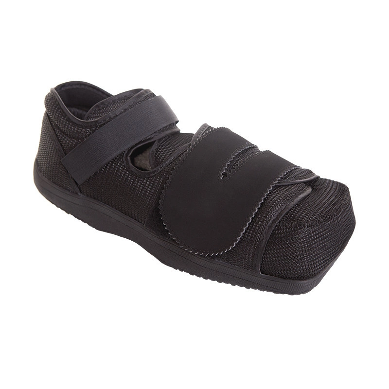 - Universal to fit either the right or left foot, non-slip rocker sole, Velcro closure system enabling it to accommodate large deformities or postoperative dressings, made from a breathable material. The front of the shoe features a toe cap that can be atta